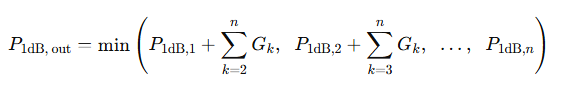 To derive the cascaded P1dB, each stage’s P1dB is referred to the output by accounting for the cumulative gain of the preceding blocks. This calculation is based on the formula: