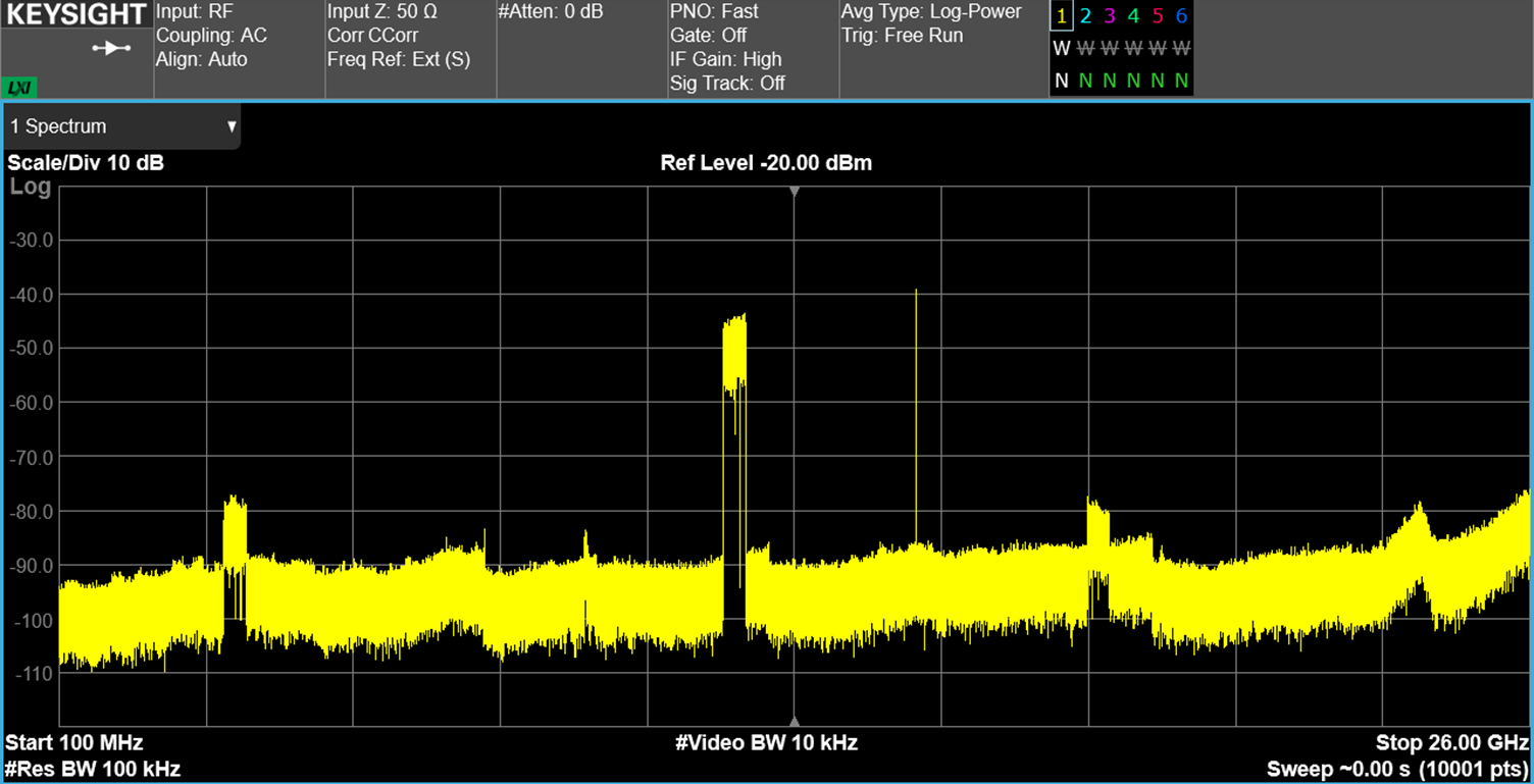By utilizing a high IF, unwanted components such as DAC images, RF images, and LO leakage are positioned far from the signal bandwidth (see the spectrum image below of the tx path). This spectral ‘breathing room’ enables highly efficient filtering, ensuring a clean and compliant spectrum across the entire 10 MHz to 25.8 GHz range.