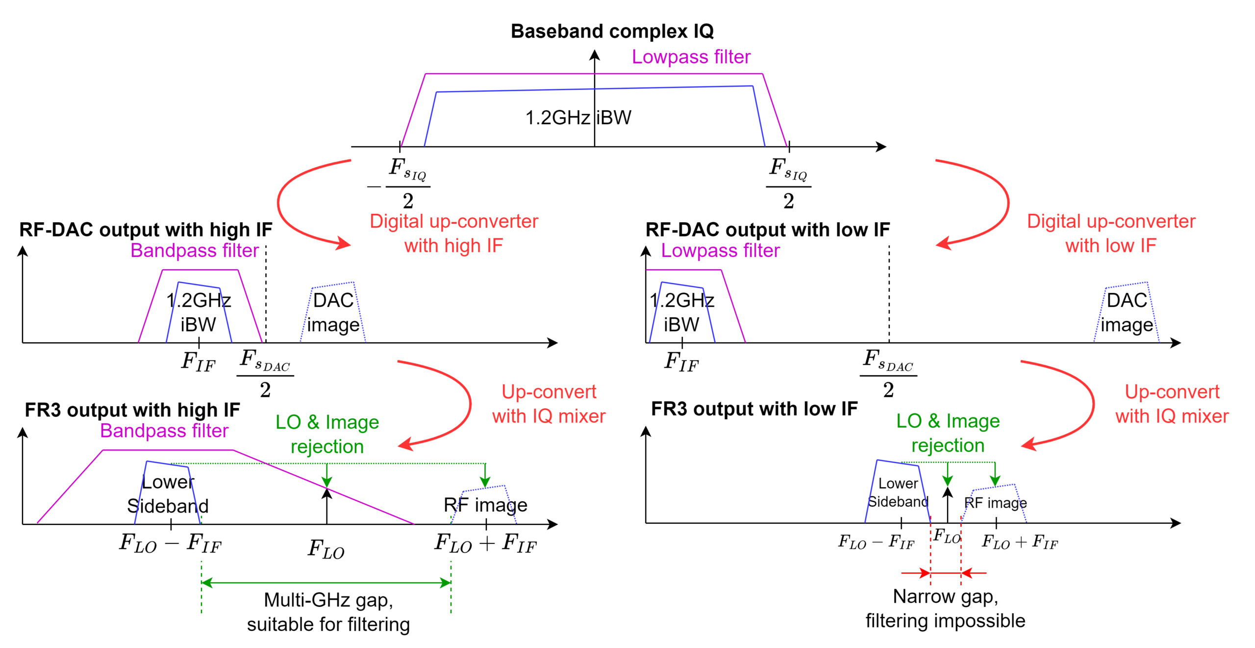One relevant feature of the WFC725A (that applies to all Wupatec’s communication modules) is the strategic optimization of Intermediate Frequency (IF) selection. In the transmit path, the baseband signal is interpolated and shifted to an IF via a Digital Upconverter (DUC), followed by bandpass filtering to suppress DAC images. The signal is then upconverted to the FR3 band using an IQ modulator. By utilizing a sufficiently high IF, unwanted components such as RF images and LO leakage are positioned far from the signal bandwidth, allowing for efficient filtering. This architectural advantage would be lost if a lower IF were used, as shown in the diagram below: