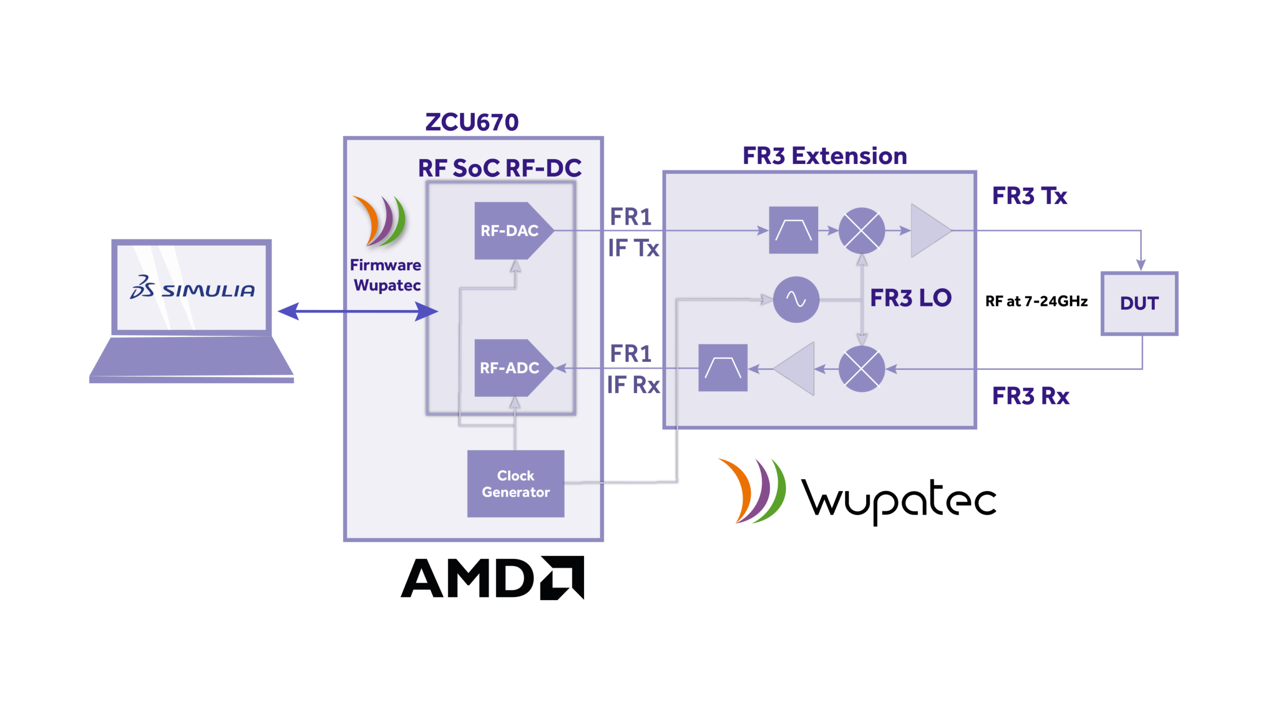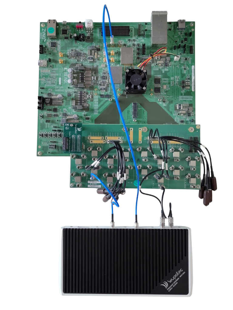 This setup was first designed for use with the AMD ZCU670 evaluation kit and WUPATEC VST firmware. This compact module delivers up to 1.2 GHz instantaneous bandwidth. It supports sampling rates up to 1.474 GSa/s, making it ideal for multi-carrier, high-order modulation, and MIMO scenarios. Its vector signal generation and analysis capabilities allow precise EVM and ACPR characterization across 7–26 GHz, helping accelerate the design and validation of FR3-ready radio units.